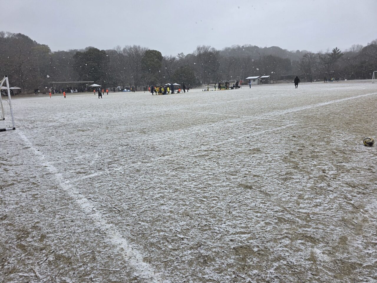 底冷えする寒さで雪も降ってきてグランドは白くなった。